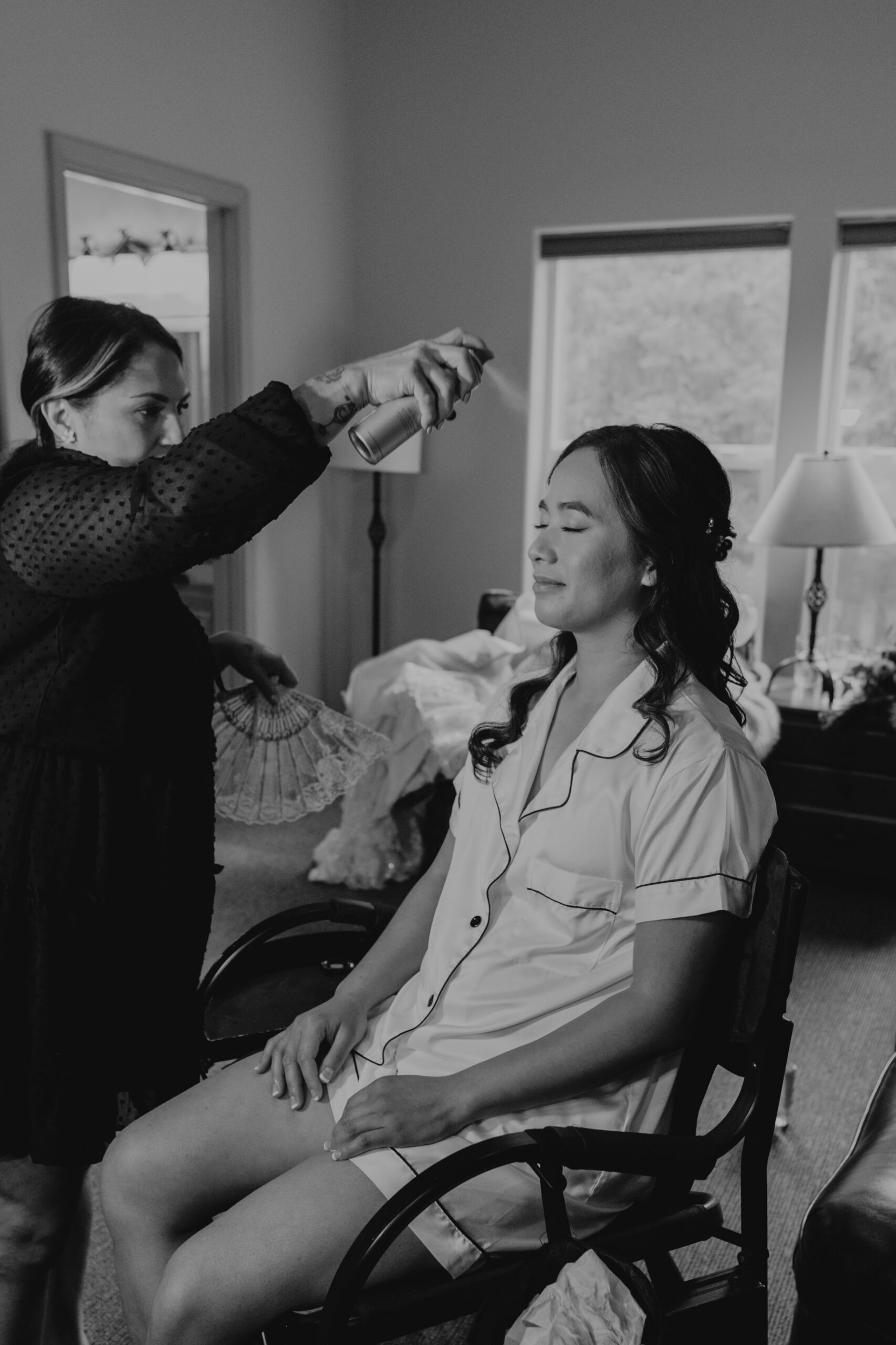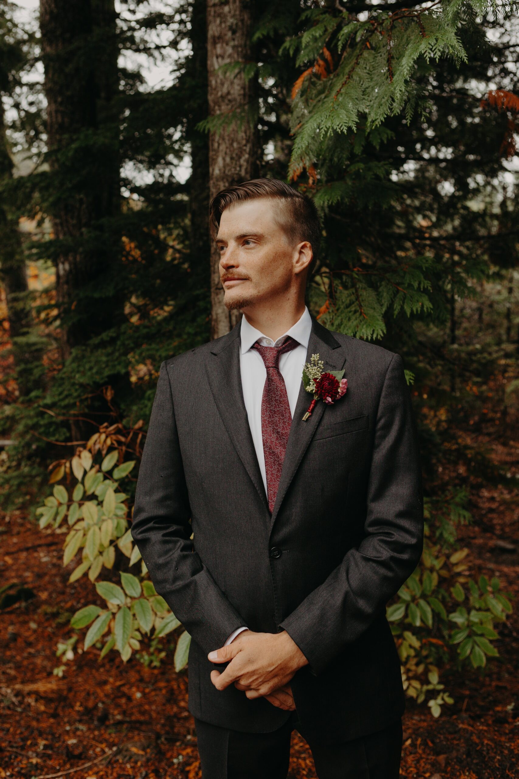 U + L got ready with their guests at a cabin at Government Camp on separate levels, so that they could be surprised for the first look. U was upstairs getting her hair and makeup professionally done by the amazing Lash and Lox, while L got ready downstairs in a separate room. Once it was time for the boutonnieres, we stepped outside for some natural lighting. L and his brother fastened on their boutonnieres; this step always takes the longest so make sure you plan for extra time!